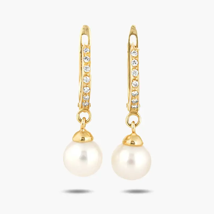 עגילי זהב צהוב 14K משובצים פנינה ו 16 יהלומים נוצצים. אורך העגיל 2.5 ס"מ. אורך הסוגר המשוסץ יהלומים 1.2 ס"מ