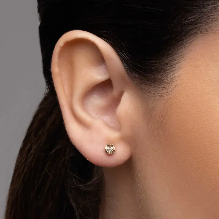 עגילי זהב 14K צמודים המשובצים 2 יהלומים טבעיים ונוצצים מוקפים בזהב בעיבוד לייזר המגביר את הנצנוץ. קוטר העגילים 0.5 ס"מ.