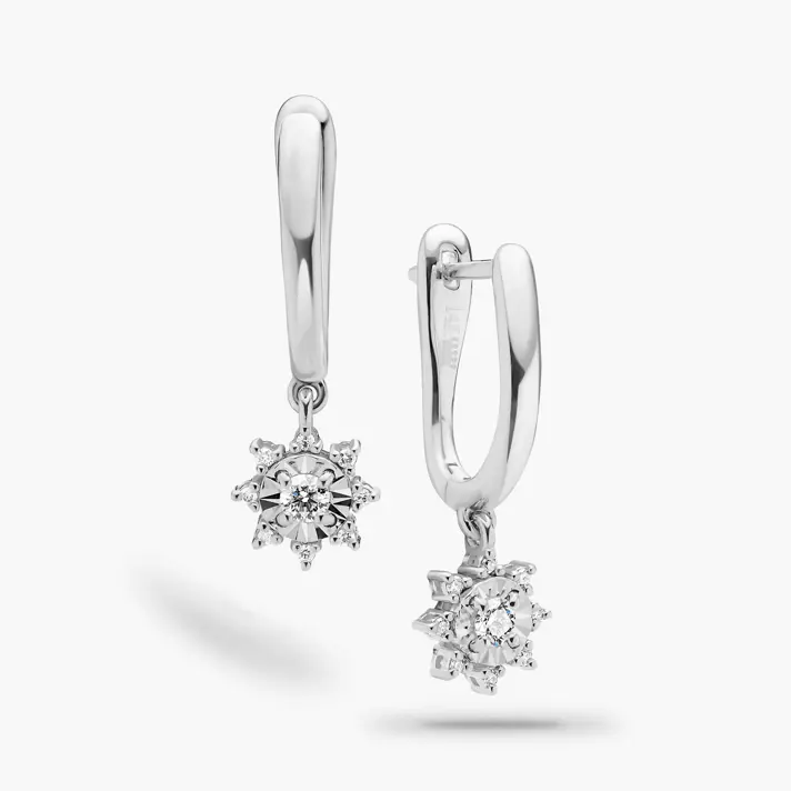עגילי זהב 14K עליהם תלויה שמש מזהב המשובצת יהלומים בין קרניה ובמרכזה יהלום מוקף בזהב בעיבוד לייזר מנצנץ. אורך העגילים 2 ס"מ.