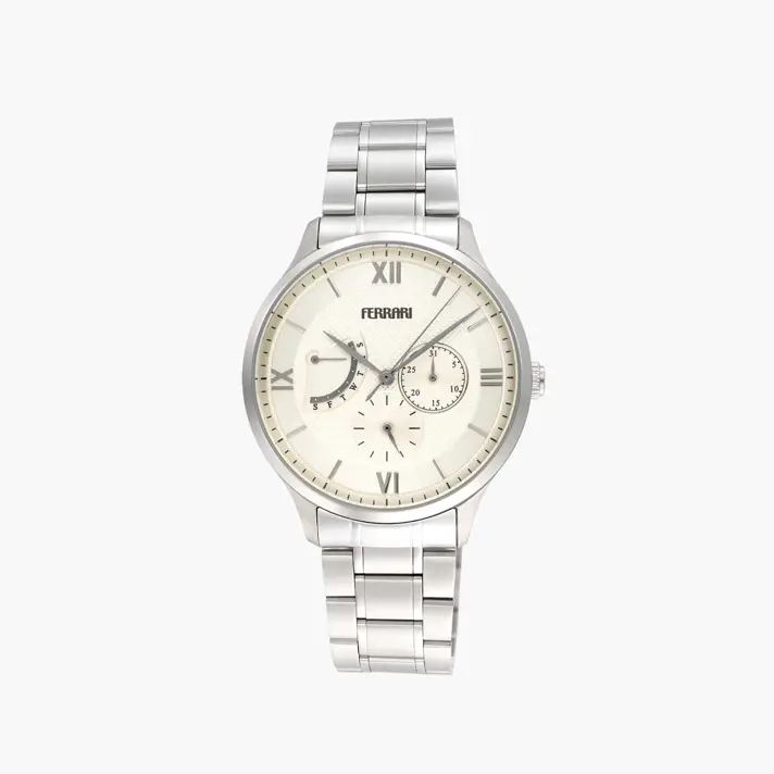 שעון FERRARI אלגנטי לגברים בעל לוח בגוון קרם המציג את השעה ובשני שעונים מוקטנים את היום והחודש. במד נוסף ניתן לראות את היום בשבוע. לשעון סימוני ספרות , מחוגים,קופסה וצמיד כסופים. השעון עמיד למים עד ל 50 מטר וקוטרו 41 מ"מ.