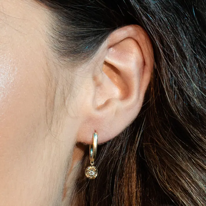 עגילי זהב 14K ועליהם תלויים 2 יהלומים טבעיים ונוצצים מוקפים בזהב בעיבוד לייזר המגבר את הנצנוץ. אורך העגילים 1.3 ס"מ.