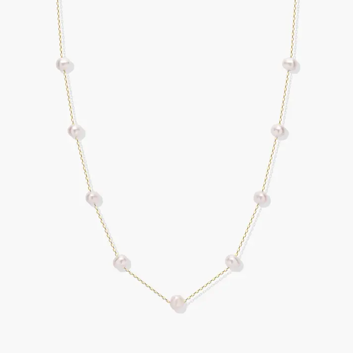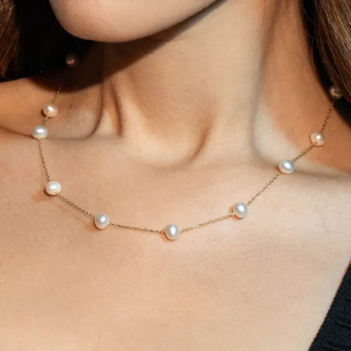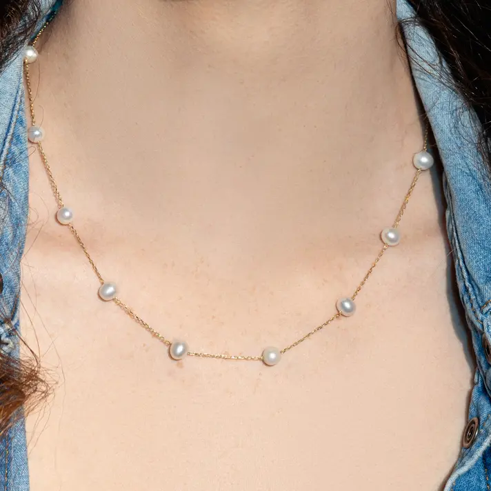 שרשרת זהב 14K קלאסית למראה נקי ומוקפד בשילוב 13 פנינים אמיתיות. אורך השרשרת 45.5 ס"מ.