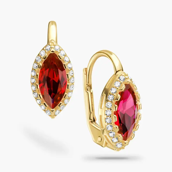 עגילי זהב עם אבן אדומה בחיתוך מרקיז מוקפת זירקונים