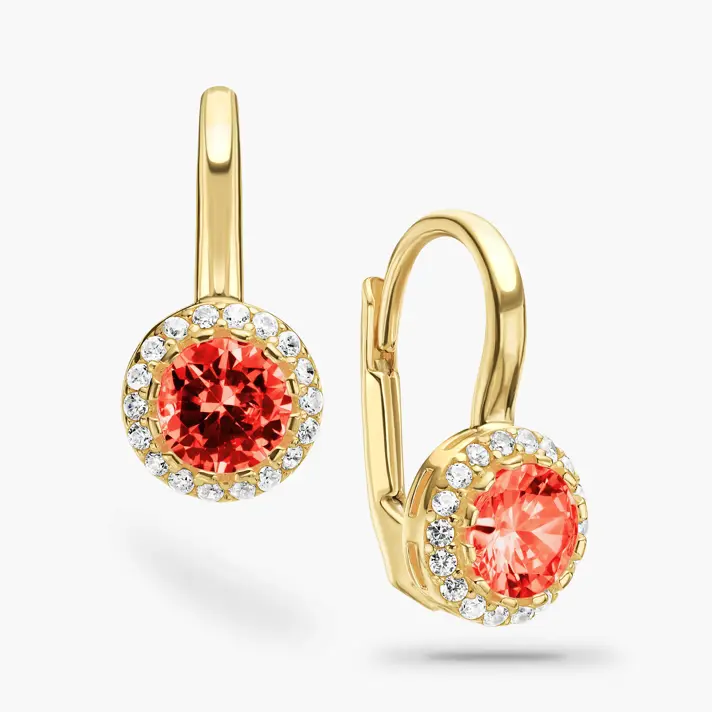 עגילי זהב 14K עם אבן סינטטית מרכזית בצבע גרנט אדום וזרקונים מנצנצים להגדלת אפקט היוקרה. נתוני העגילים: גובה1.7 ס"מ, קוטר אבן 0.8.