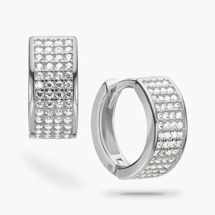 עגילי חישוק עשויים זהב לבן 14K משובצים בזירקונים בעלי מראה יוקרתי. קוטר 1.3 ס"מ, רוחב 0.7 ס"מ.