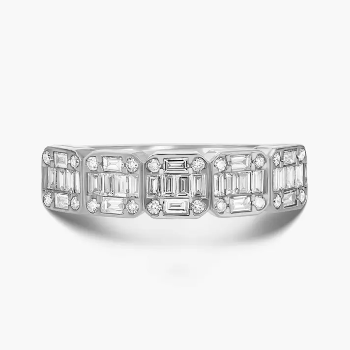 טבעת זהב 14K המעוצבת עם 5 ריבועים משובצים 50 יהלומים טבעיים ונוצצים בחיתוך באגט יוקרתי ועגול.