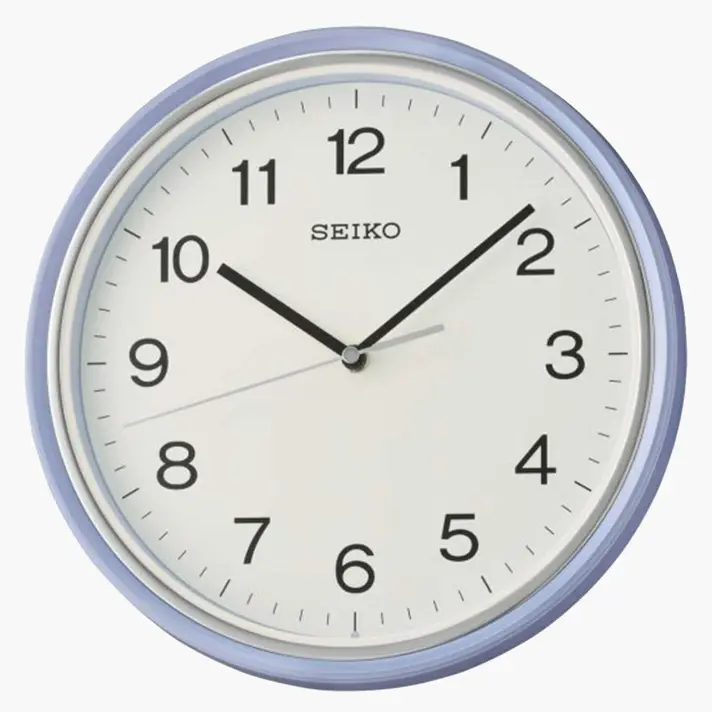 שעון קיר מבית SEIKO יפן, גוף השעון עשוי פלסטיק בגוון כחול ספרות השעון ערביות וכוללות 3 מחוגים. קוטר השעון 27.5 ס"מ. מנגנון השעון קוורץ הפועל באמצעות סוללה AA.