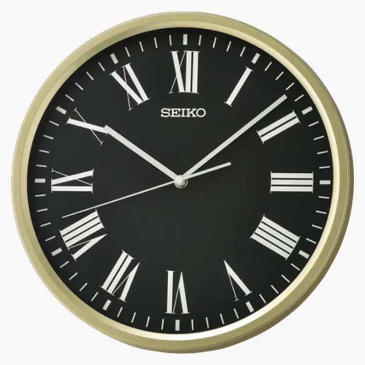 שעון קיר מבית SEIKO יפן. גוף השעון עשוי פלסטיק בגוון זהב מטאלי, לוח השעון בגוון שחור,בעל ספרות ערביות וכוללות 3 מחוגים, קוטר השעון30.5 ס"מ, עומק 4.2 ס"מ. לשעון מנגנון קוורץ הפועל באמצעות סוללה AA.