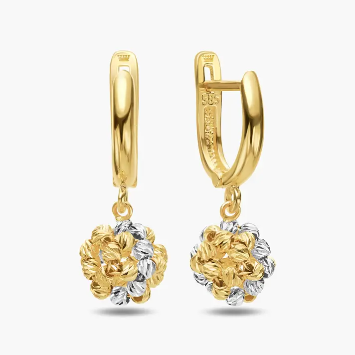 עגילי ונציה נופלים עשויים זהב 14K צהוב ולבן, מקולקציית ה- GOLDEN GLOW החדשה השומרת על קווים קלאסיים ובעיצוב עכשווי. העגילים עשויים כדורי זהב. אורך העגיל 2.1 ס"מ קוטר כדור 0.7 ס"מ.