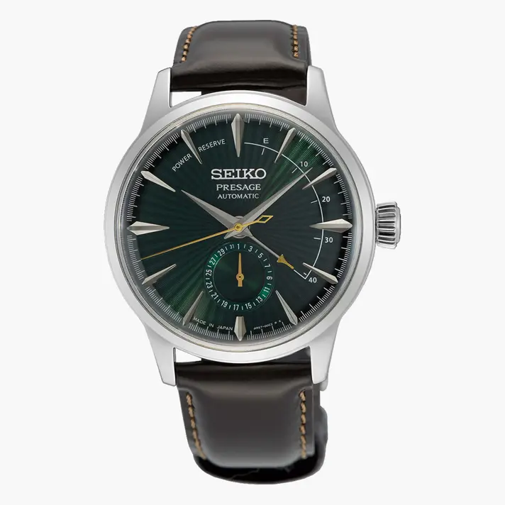 שעון SEIKO PRESAGE מסדרת ה- COCKTAIL TIME שעונים בהשראת תרבות הקוקטיילים היפנית ומשקאות ספציפיים מה-Star Bar באזור גינזה המתוחכם של טוקיו. דגם זה נוצר בהשראת הקוקטייל Midnight Mockingbird. השעון בעל לוח ירוק עמוק מהפנט, מחוג שניות מוזהב, תאריכון גלגל ורצועת עור כהה המעניקים לדגם תחושה קלאסית. לשעון מנגנון 4R57 אוטמטי, הנטען מתנועת היד, בעל עתודת כוח של 41 שעות. לשעון זכוכית HARDLEX איכותית למניעת שריטות ומכוון עתודת כח. קוטר השעון 40.5 מ"מ והוא עמיד עד 50 מ' עומק. חלקו האחורי של השעון שקוף ומאפשר הצצה לפעילות המנגנון.