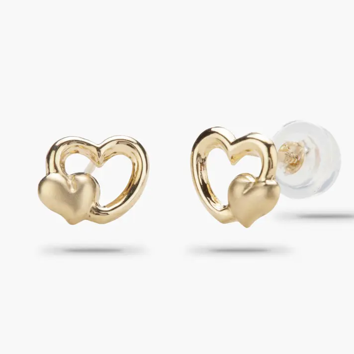 עגילי זהב 14K צמודי אוזן, בצורת לב המחזיק לב נוסף.
