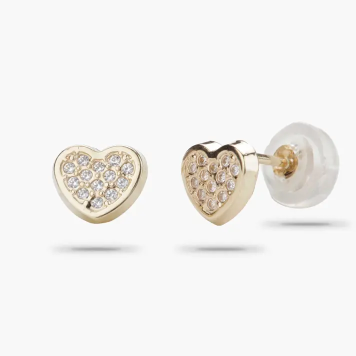 עגילי זהב בצורת לב ובשיבוץ זרקונים נוצצים