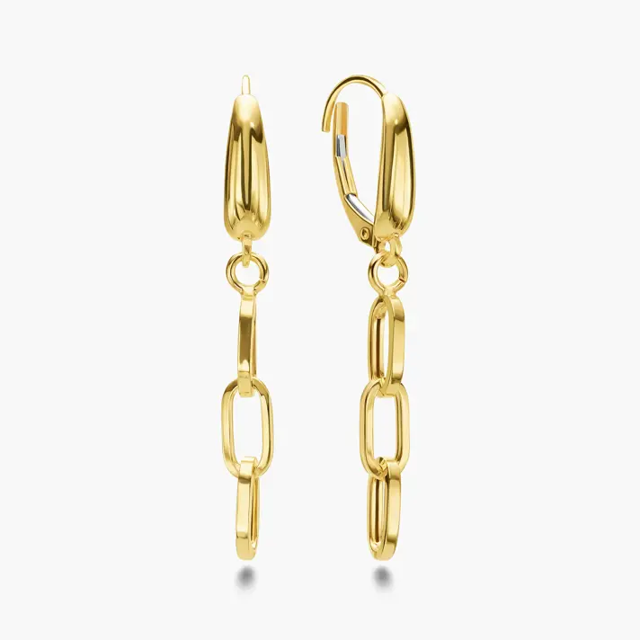 עגילי זהב 14K מסדרת Paper clip הבנויים מ 3 חוליות זהב בגודל 0.3*0.7 ס"מ ובאורך 3.7 ס"מ.