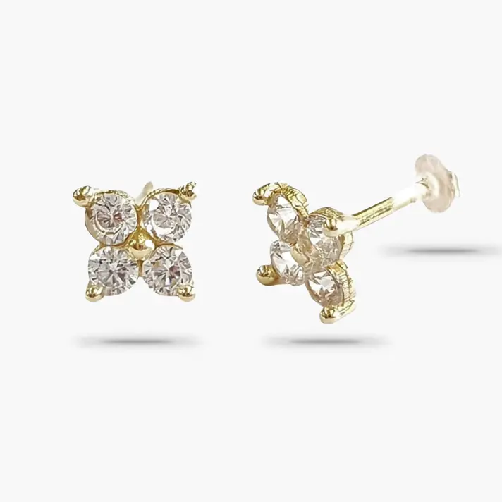 עגילי זהב 14K צמודי אוזן בצורת תלתן המשובץ ב 4 זרקונים נוצצים. מידות העגילים 4 מ"מ.