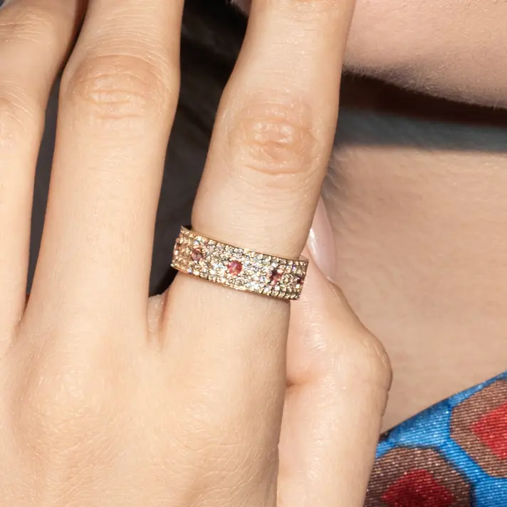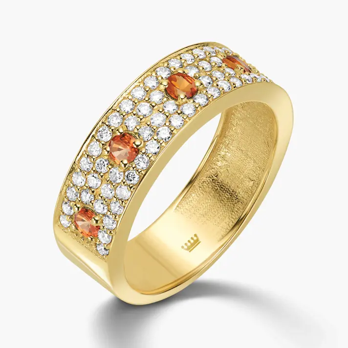 טבעת זהב 14K מקולקציית ה luxury collection. הטבעת משובצת 70 יהלומים טבעיים ונוצצים בשילוב 5 אבני חן מסוג ספיר בגוון כתום , למראה יוקרתי מלא נוכחות.