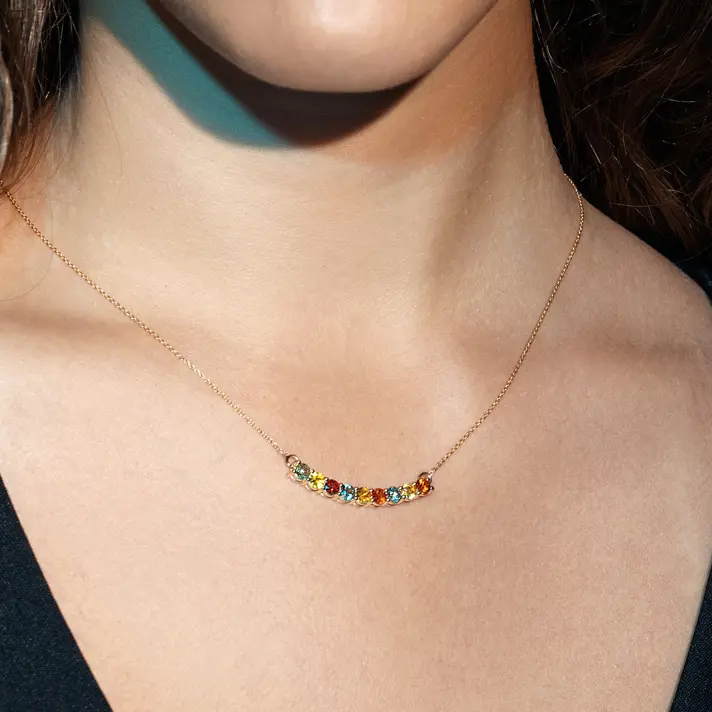 תליון זהב 14K משובץ ב 9 אבני ספיר צבעוניות היוצרות מראה רענן ועדכני. אורכו של התליון 2.7 ס"מ ורוחבו 3 מ"מ. התליון מגיע עם שרשרת באורך 46 ס"מ.