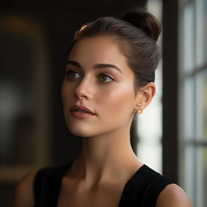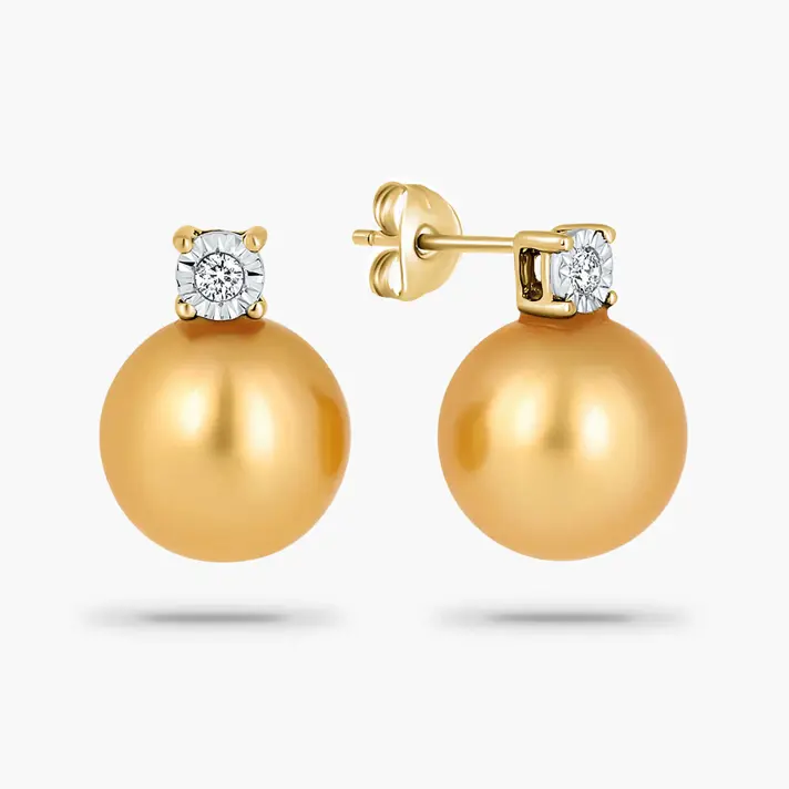 זוג עגילי זהב 14K משובצות בפניני גולדן סאות' סי עגולות ממים מלוחים, בגוון צהוב טבעי בגודל 11 מ"מ וביהלום טבעי ונוצץ.
