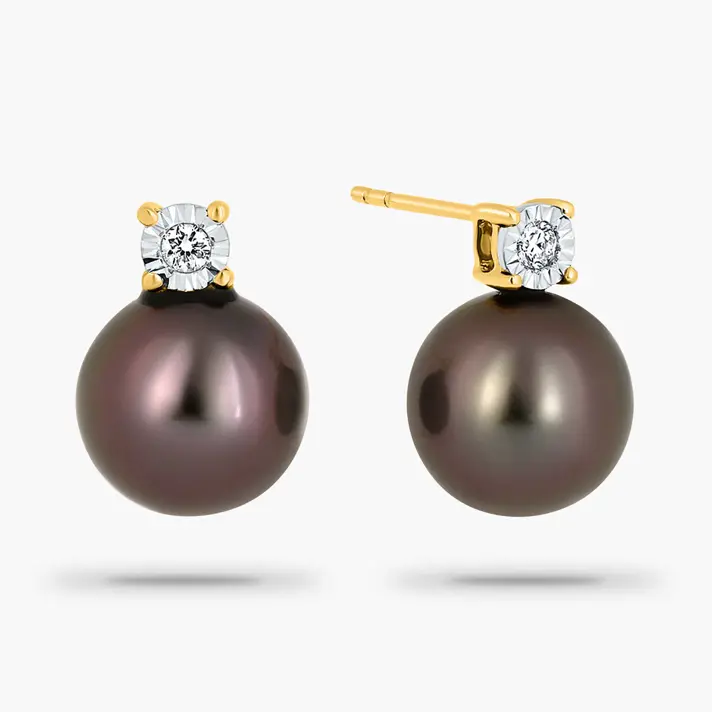 זוג עגילי זהב 14K צמודי אוזן משובצים בפניני טהיטי עגולות ממים מלוחים, בגוון שחור טבעי בגודל 11 מ"מ וביהלום טבעי ונוצץ.