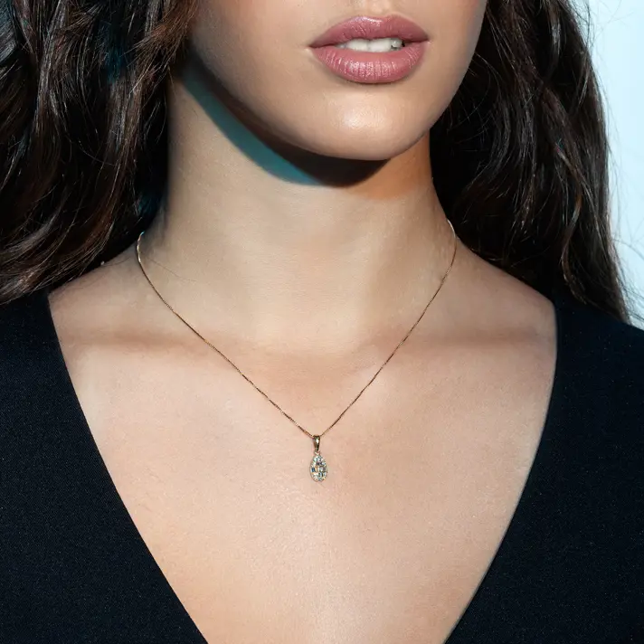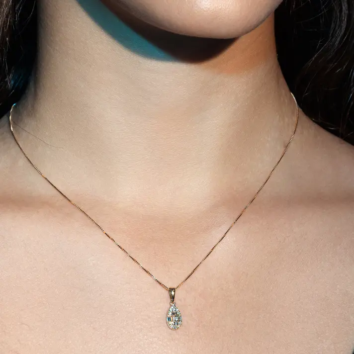 תליון זהב 14K בצורת טיפה המשובץ 19 יהלומים נוצצים וטבעיים . אורך התליון כולל לולאה 1.7 ס"מ, רוחבו 0.6 ס"מ