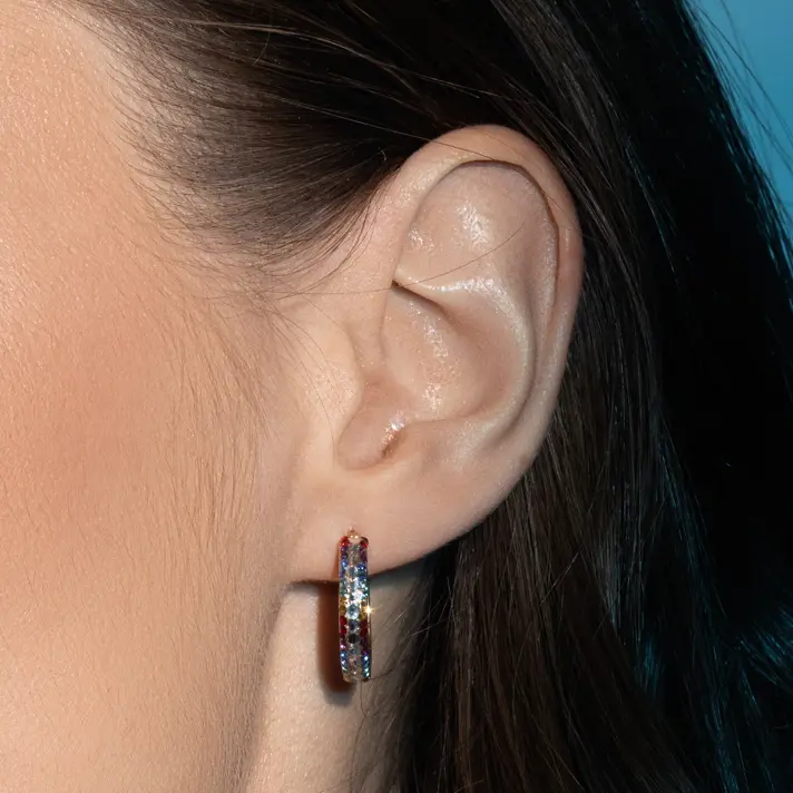 עגילי חישוק בזהב 14K משובצים באבני סברובסקי צבעוניות ונוצצות. מידות 1.9*0.35 ס"מ.
