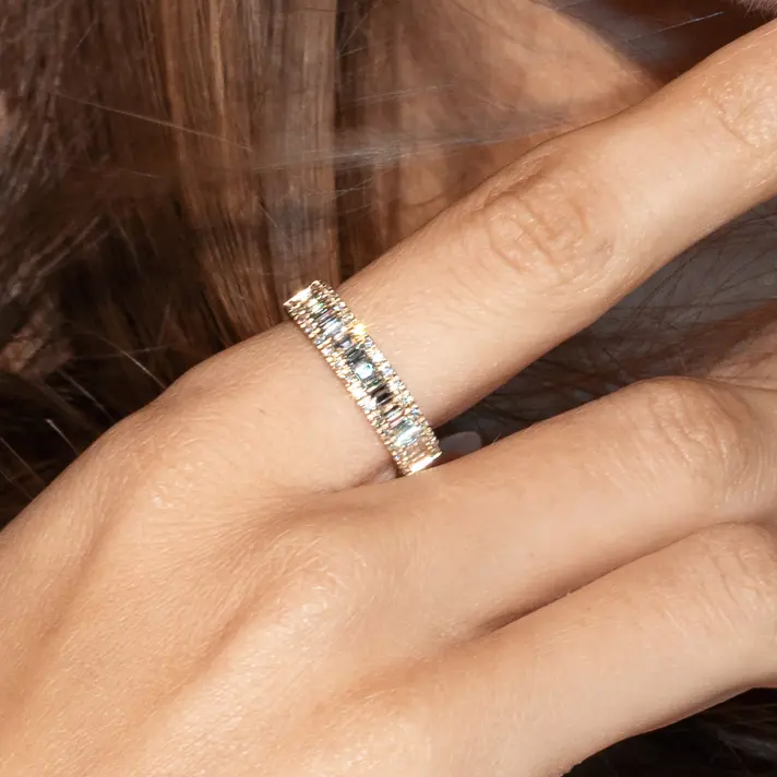 טבעת זהב 14K הבנויה משתי טבעות משובצות 51 יהלומים עגולים ובניהן יהלומי באגט יוקרתיים ונוצצים. סה"כ משובצים בטבעת 52 יהלומים טבעיים ונוצצים. רוחב הטבעת 0.5 ס"מ