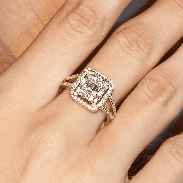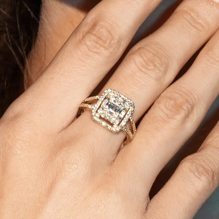 טבעת זהב 14K ובמרכזה מבנה מרובע המתנשא מעל לגובה הטבעת ומשובץ ביהלומי באגט יוקרתיים. סה"כ משובצים בטבעת כ 104 יהלומים טבעיים ונוצצים בנקיון SI ובצבע G. אורך ראש הטבעת 1.4 ס"מ, רוחב - 1.2 ס"מ