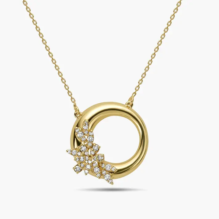 תליון פרח עגול משובץ 35 יהלומים טבעיים ונוצצים, התליון מגיע מחובר לשרשרת זהב 14K זהב.