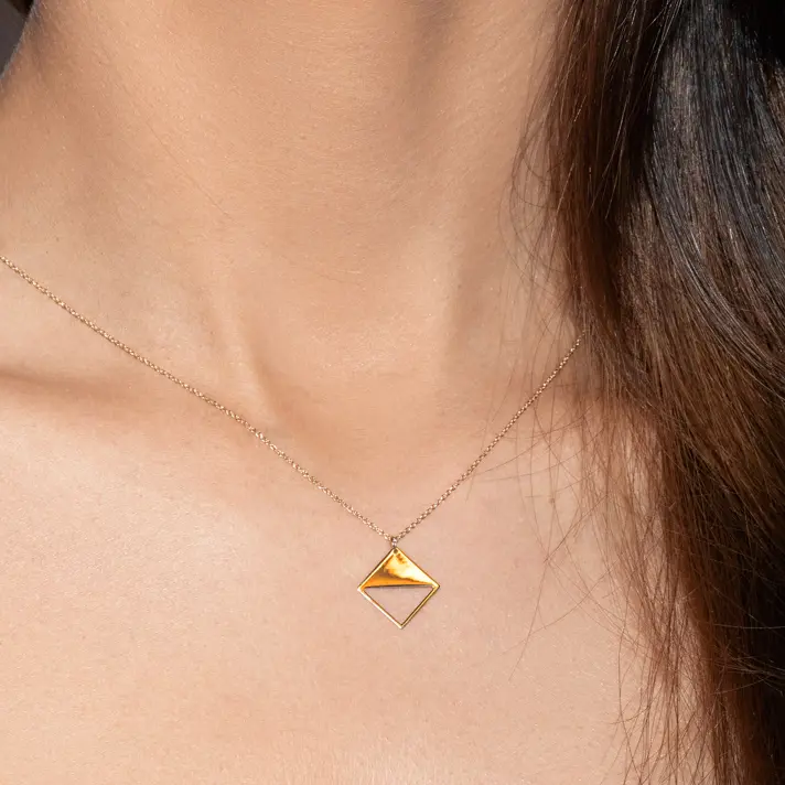 שרשרת זהב 14K מינימליסטית עם תליון מעוין מזהב, חציו מלא וחציו רק קו מתאר. מידות המעוין 1.1 ס"מ. מידות השרשרת ס"מ + 2.5 ס"מ הארכה נוספים.