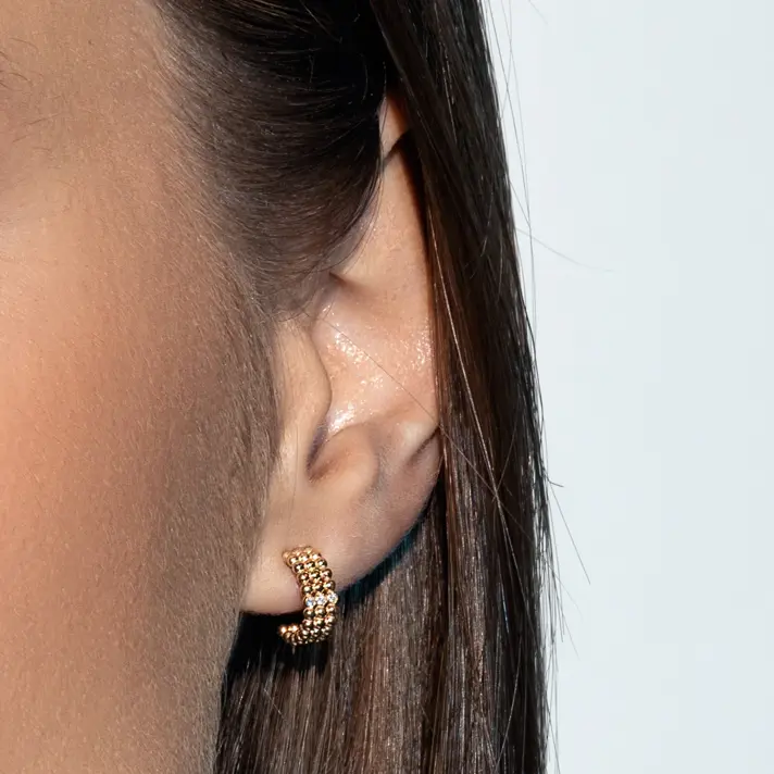 עגילי זהב 14K בסגנון בננה ובטקסטורת נקודות ובשיבוץ 6 יהלומים טבעיים ונוצצים. קוטר העגילים 0.9*0.3 ס"מ.