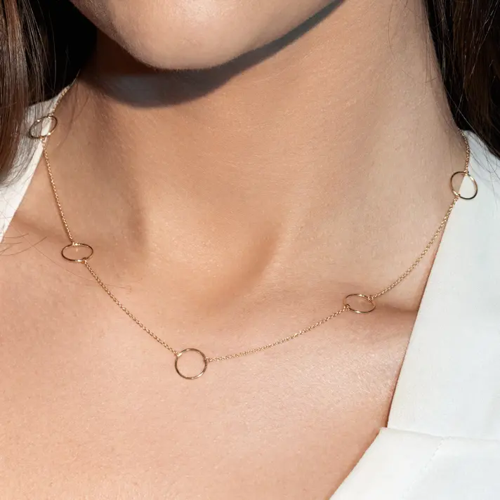 שרשרת זהב 14K בעיטור 5 חישוקי זהב בקוטר 1 ס"מ. אורך השרשרת 42 ס"מ + 2.5 ס"מ הארכה נוספים.