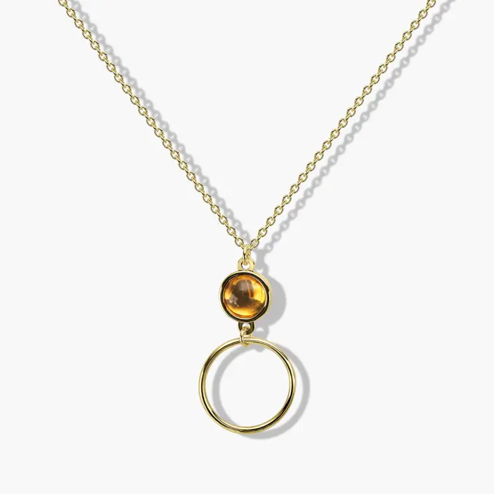 שרשרת זהב 14K בשילוב תליון עגול משובץ אבן חן מסוג סיטרין. אורך השרשרת 42 ס"מ + 2.5 ס"מ הארכה נוספים, קוטר התליון 1 ס"מ.