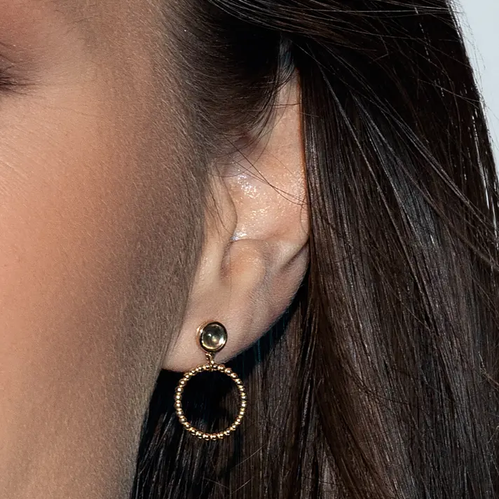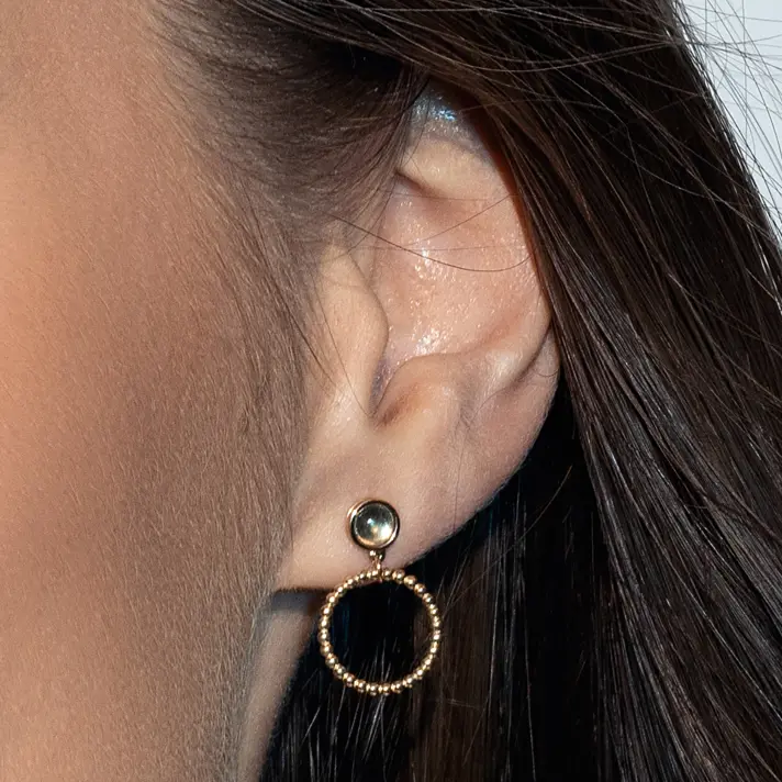 עגילי חישוק מזהב 14K בטקסטורת נקודות המחוברים לאבן sky blue. אורך העגילים 1.8 ס"מ, קוטר 1.2 ס"מ.