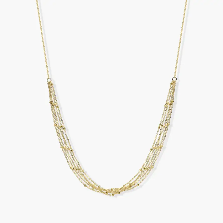 שרשרת זהב 14K הכוללת 5 שורות של שרשראות משולבות כדורי זהב בקוטר 1.5 ס"מ. אורך השרשרת 42 ס"מ + 2.5 ס"מ נוספים.