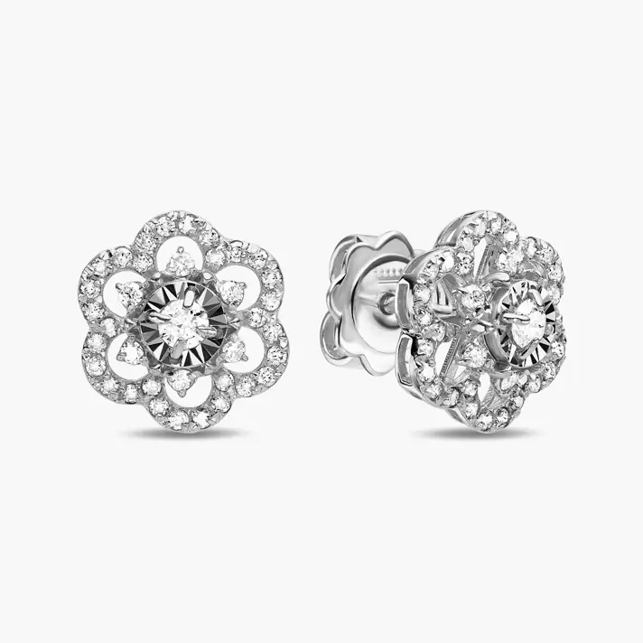עגילי זהב 14K צמודי אוזן בצורת פרח משובצים 74 יהלומים טבעיים ונוצצים.