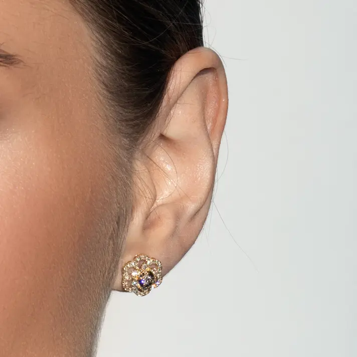 עגילי זהב 14K צמודי אוזן בצורת פרח משובצים 74 יהלומים טבעיים ונוצצים.