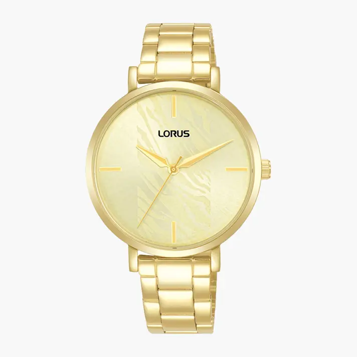 שעון לורוס נשים מבית Seiko יפן. לשעון מנגנון קוורץ. לוח השעון בגוון שמפניהעם טקסטורה של פס ספארי באמצע. לשעון זכוכית מינרלית שטוחה, גוף השעון והצמיד עשויים פלדת אל חלד איכותית. קוטר השעון 34 מ"מ והוא עמיד במים עד 50 מ'.