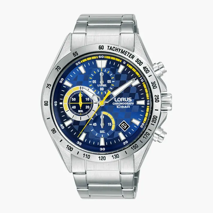 שעון לורוס לגבר מבית Seiko יפן. לשעון מנגנון קוורץ. לוח השעון בגוון כחול עם טקסטורת דמקה וכולל תאריכון וכרונוגרף 1/100 שניות . מחוגי השעון בגוון צהוב שבולט בבירור על הלוח לקריאה קלה. לשעון זכוכית מינרלית שטוחה, גוף השעון והצמיד עשויים פלדת אל חלד איכותית. קוטר השעון 43.5 מ"מ והוא עמיד במים עד 100 מ'.
