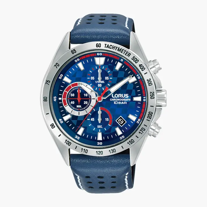שעון לורוס לגבר מבית Seiko יפן. לשעון מנגנון קוורץ. לוח השעון בגוון כחול בטקסטורת דמקה עם נגיעות אדומות וכולל תאריכון וכרונוגרף 1/100 שניות . לשעון זכוכית מינרלית שטוחה, גוף השעון עשוי פלדת אל חלד איכותית. רצועת השעון עשויה מעור איכותי בגוון כחול, קוטר השעון 43.5 מ"מ והוא עמיד במים עד 100 מ'.
