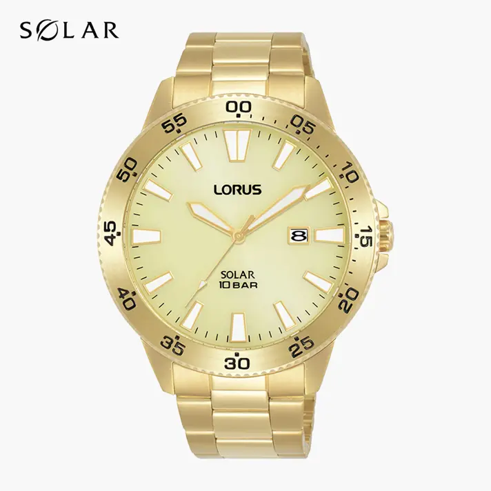 שעון לורוס גברים סולארי המופעל על ידי האור ואינו נזקק לסוללה. לוח השעון בגוון שמפניה עדין. גוף השעון והצמיד עשויים פלדת אל חלד איכותית בגוון מוזהב. לשעון זכוכית קריסטל מינרלית ועמידות במים עד 100 מטר. קוטר השעון 43 מ"מ.