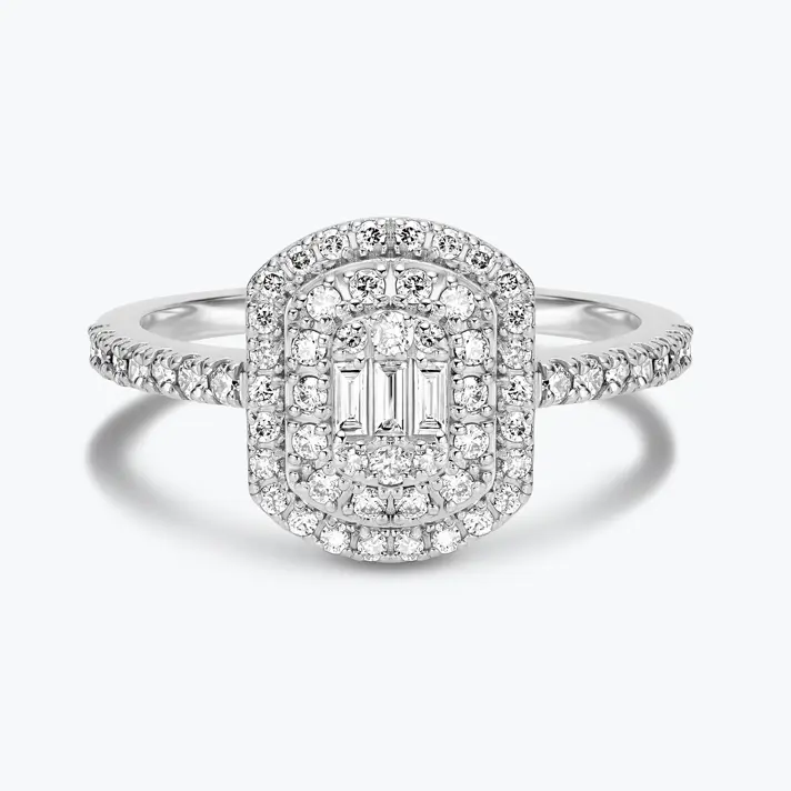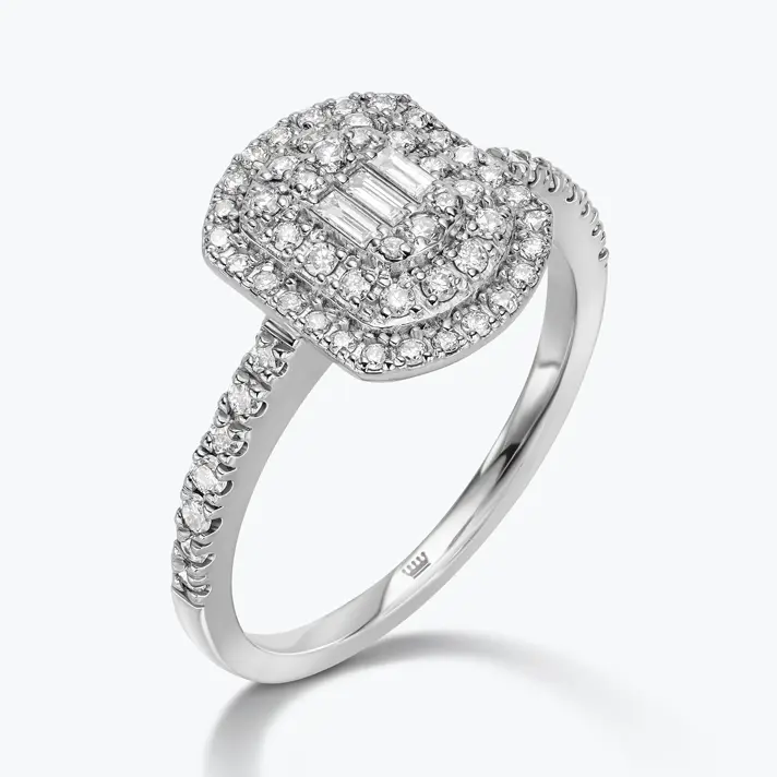 טבעת זהב 14K אמיליה משובצת 63 יהלומים טבעיים ונוצצים מתוכם 3 בחיתוך באגט היוקרתי. מידות הטבעת 1.0*1.2 ס" מ