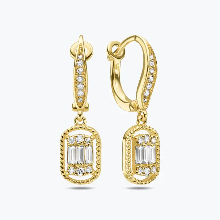 עגילי אנדריאה מזהב 14K בשיבוץ 32 יהלומים טבעיים ונוצצים מתוכם 6 בחיתוך באגט היוקרתי. מידות: אורך 2.4 ס"מ כולל סוגר, רוחב 0.6 ס"מ