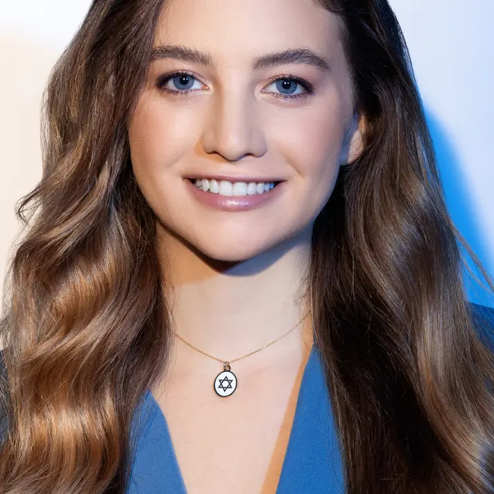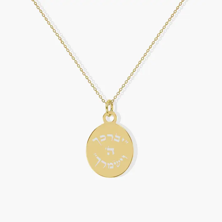 תליון ישמרך מזהב 14K עם מגן דוד וציפוי אמייל לבן, בחלקו האחורי עם הפסוק -יברכך ה' וישמרך, מתוך ברכת הכהנים.