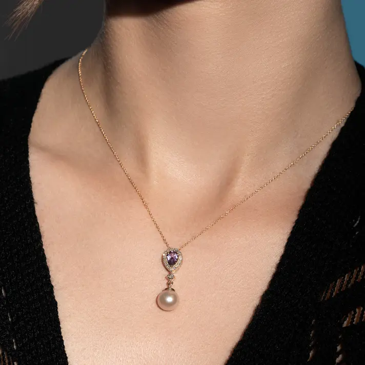 תליון טיפה בשילוב פנינה ושיבוץ יהלומים ואמטיסט