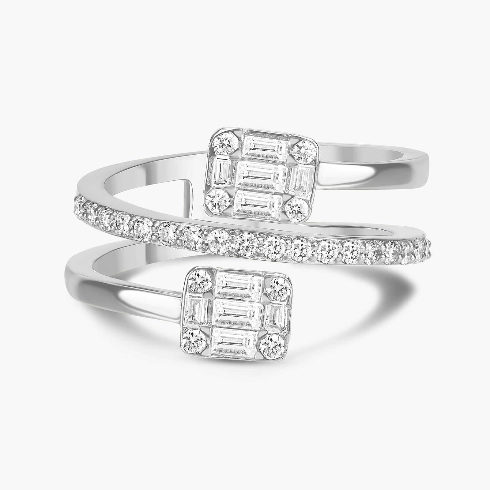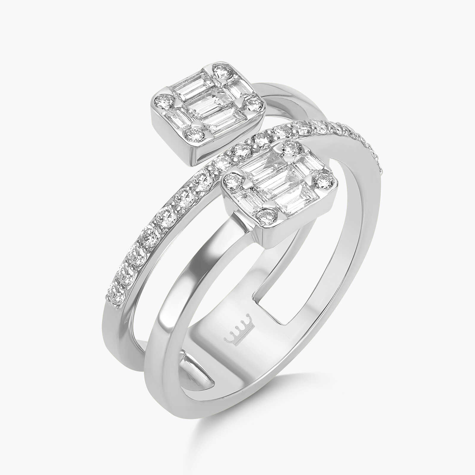 טבעת שיינא מ14K המסתלסלת על האצבע, בשיבוץ 36 יהלומים טבעיים ונוצצים מתוכם 10 בחיתוך באגט היוקרתי.