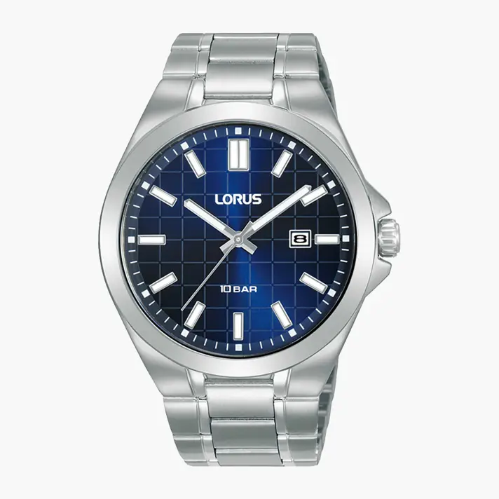 שעון לורוס גברים מבית SEIKO יפן, בעל מנגנון קוורץ. לוח השעון בגוון כחול עמוק ובטקסטורת משבצות תלת מימד. לשעון תאריכון, צמיד פלדת אל חלד איכותי, זכוכית קריסטל מינרלית ועמידות במים עד 100 מטר. קוטר השעון 42 מ"מ.