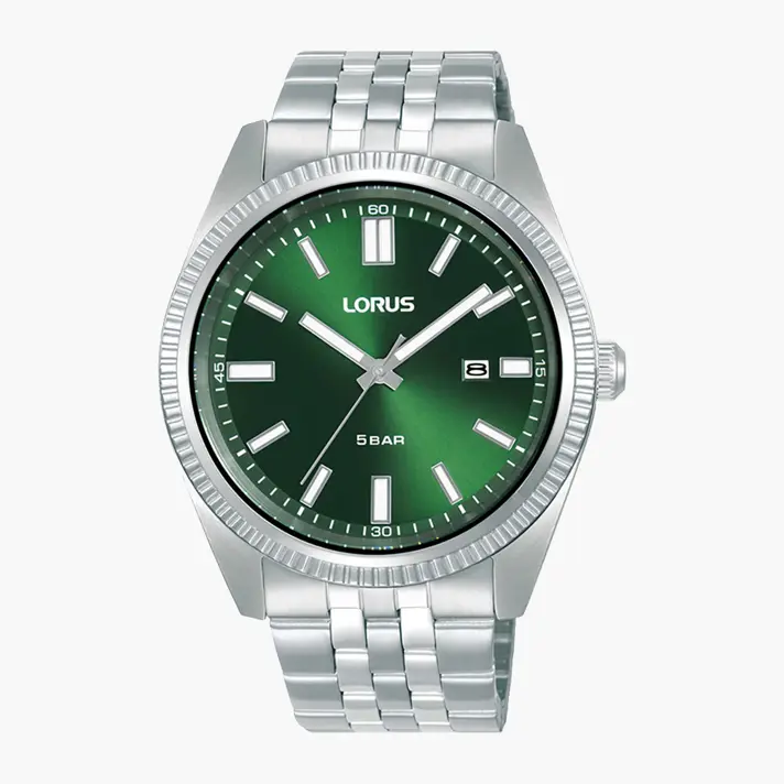 שעון לורוס גברים מבית SEIKO יפן, בעל מנגנון קוורץ. לוח השעון בגוון ירוק עמוק. לשעון תאריכון, צמיד פלדת אל חלד איכותי, זכוכית קריסטל מינרלית ועמידות במים עד 50 מטר. קוטר השעון 42 מ"מ