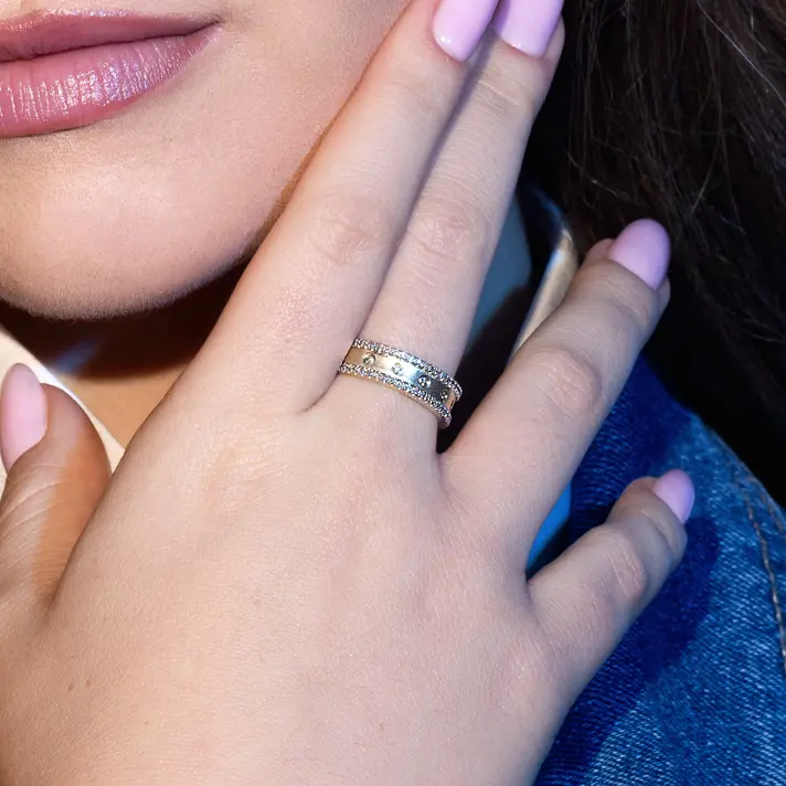 טבעת ג'יין מזהב 14K ברוחב 0.5 ס"מ ובשיבוץ 55 יהלומים טבעיים ונוצצים.