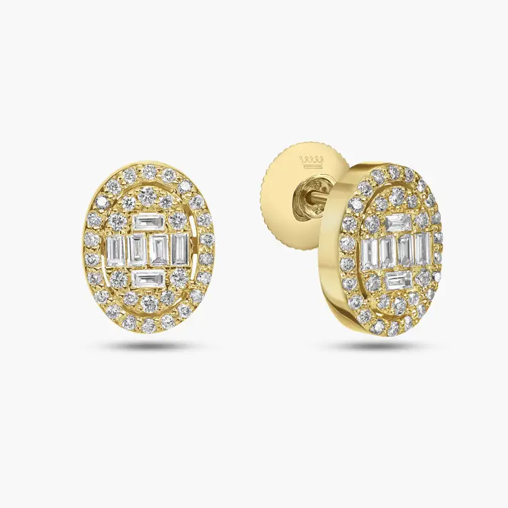 עגילי נסיה צמודי אוזן אליפטיים מזהב 14K בשיבוץ 76 יהלומים טבעיים ונוצצים מתוכם 12 בחיתוך באגט היוקרתי.