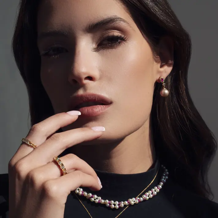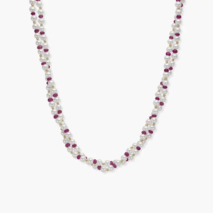 מחרוזת אלמוג כפולה מזהב 14K בשילוב פנינים, כדורי זהב ורובי בקוטר 2 מ"מ. אורך המחרוזת 42 ס"מ + 5 ס"מ הארכה נוספים.