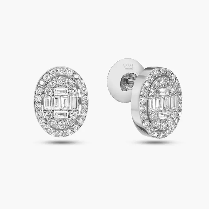 עגילי נסיה צמודי אוזן אליפטיים מזהב 14K בשיבוץ 76 יהלומים טבעיים ונוצצים מתוכם 12 בחיתוך באגט היוקרתי.